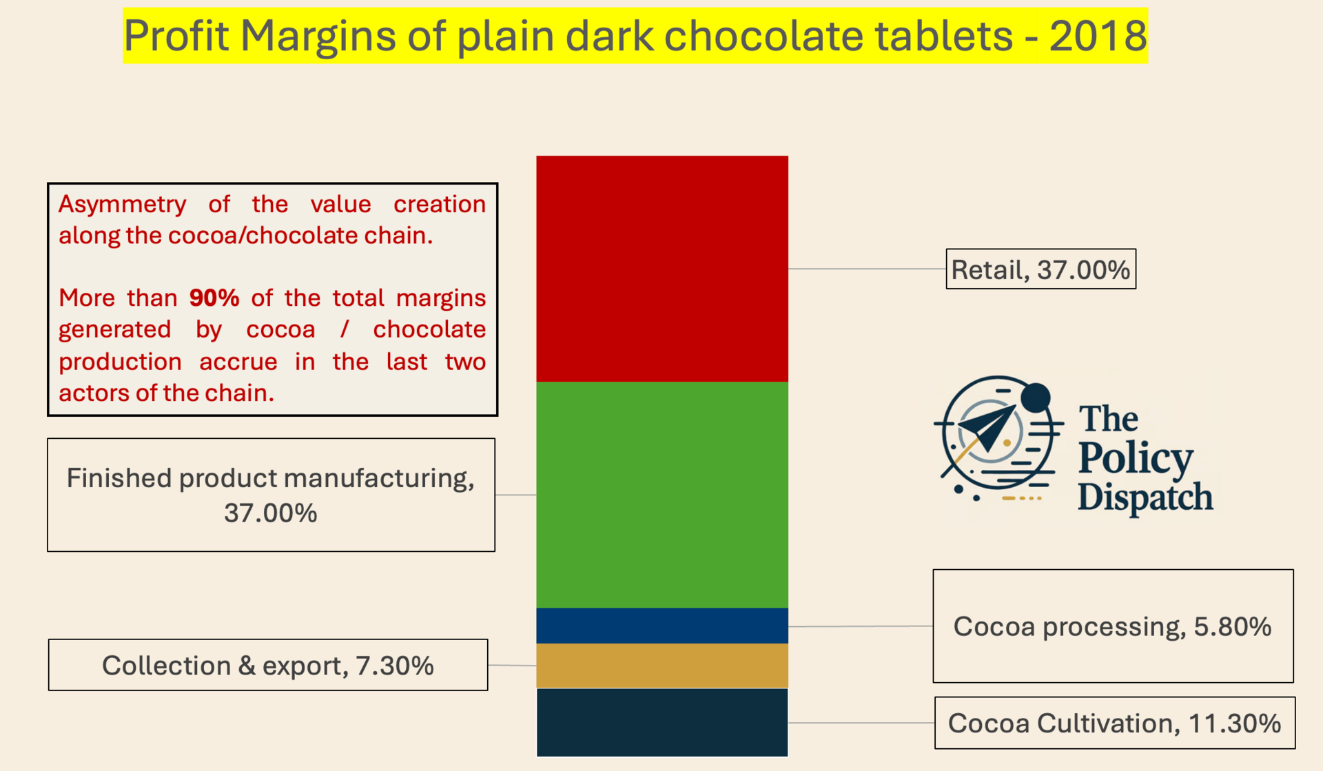 Behind all those headlines and keywords, lies another reality - that of farmers unable to capture the fruit of their labour (no pun intended). A recent study by the FAO entitled “Comparative study on distribution of value in European chocolate chains” (2024) lays out the issue of uneven profit margins amongst different actors of the supply chain of chocolate. Even more intriguing is the fact that no mainstream media has taken up the conclusions of the study (not as sexy as an el-nino destroying cultivations maybe?).