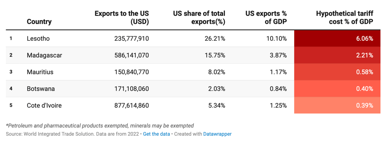 This week’s policy news has been dominated by Trump’s so called “Liberation Day”. It has been labelled as the end of an era by the British and Canadian Prime Ministers. The key question for African countries has been the future of the African Growth & Opportunity Act (AGOA) passed by the US congress in 2000. This Act has allowed African countries to export more than 1,800 products to the US market duty-free; de facto giving them an edge over other exports. Is it the end of US-Africa economic cooperation ? While in the immediate aftermath of the announcements, the answer would seem a yes. A deeper look reveals a more nuanced no. The reasons are stated below. Before that though, African countries need to learn to negotiate 🤝 (no kidding).